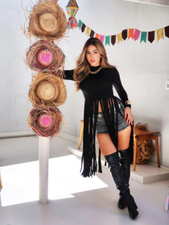 Com um toque ousado e cheio de atitude, a Blusa Geisa traz franjas longas que garantem movimento e estilo ao look. Perfeita para quem quer se destacar com muita personalidade.