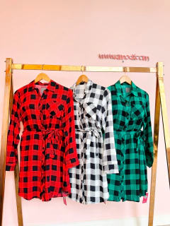 Chemise Xadrez Ágata confeccionada em tecido de viscose, possui fechamento frontal em botões, um bolso frontal, passador e cordão para amarração, mangas longas e golinha. Use e arrase!