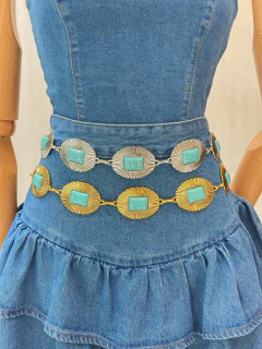 Um verdadeiro statement piece. O Cinto Rafa combina o brilho elegante do dourado/prateado com pedras em azul-turquesa que evocam sofisticação e frescor. Ideal para elevar produções básicas ou complementar looks boho-chic com originalidade e charme artesanal.