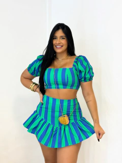 Conjunto Cropped Shortsaia Azul Cami, confeccionado no algodão. O cropped, com seu design ajustado e listras elegantes, destaca a silhueta e traz um ar de frescor e estilo ao look. A peça é complementada pelo shorts saia listrado, que oferece a praticidade e conforto de um shorts com a feminilidade e charme de uma saia.