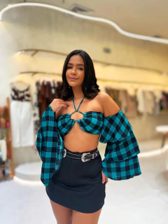 Cropped Xadrez Verde/Preto Taci, confeccionado no viscose. O cropped xadrez é uma escolha moderna e charmosa que celebra o estilo clássico com um toque contemporâneo, perfeito para mulheres que gostam de unir tradição e inovação em suas produções diárias.
