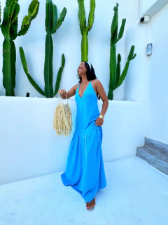 Vestido Longo Azul Liana, confeccionado no viscose. Com decote em V e alça é a escolha ideal para quem busca um look elegante e sofisticado, sem abrir mão do conforto. Confeccionado em tecido leve e esvoaçante, esse vestido possui um caimento perfeito que valoriza a silhueta de forma delicada. O decote em V alonga o pescoço e destaca o colo, enquanto as alças finas adicionam um toque de feminilidade e sutileza.